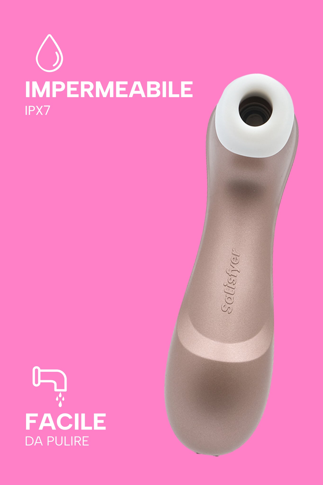 Consigliamo la lubrificazione della testina di Satisfyer Pro 2 con una buona dose di lubrificante ad acqua per facilitare la stimolazione e non danneggiare il materiale. Prima e dopo l'utilizzo, è necessario pulire il toy con uno spray antibatterico specifico per sex toys.