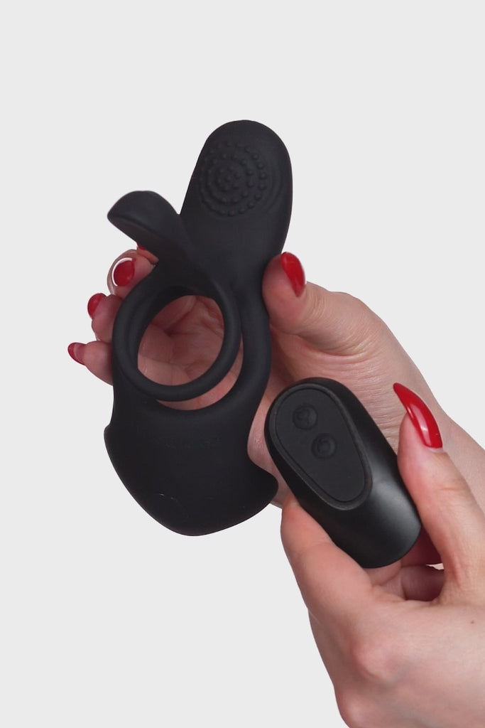 Inserisci il pene nei due anelli, con i testicoli che appoggiano sulla base larga. Tieni premuto il pulsante ON per avviarlo e utilizza il telecomando per cambiare vibrazione! Si consiglia di usarlo con un lubrificante a base d'acqua. Lavalo prima e dopo l'uso con un toy cleaner.