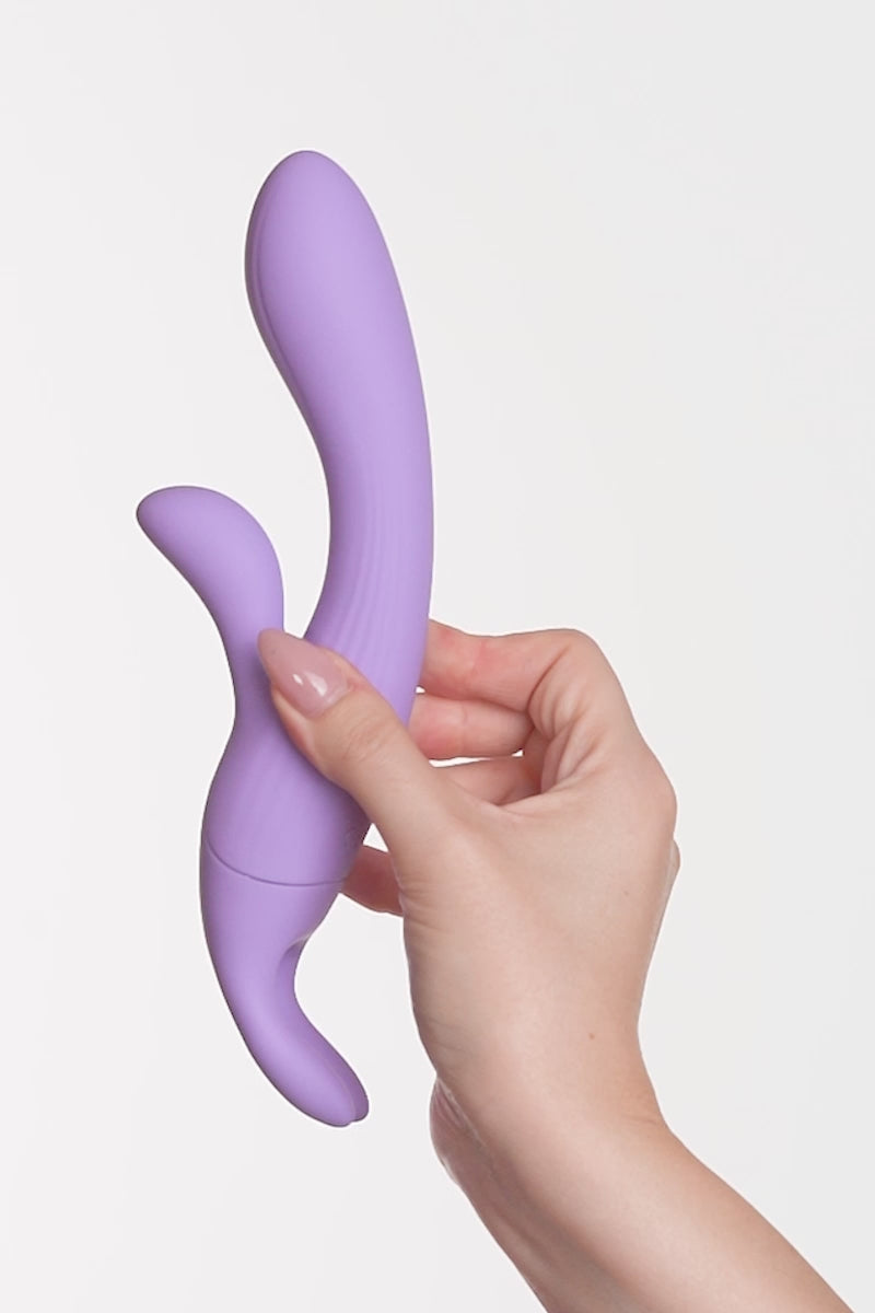 Da un lato, un rabbit per una doppia stimolazione morbida e avvolgente. Dall’altro, due orecchiette vibranti che accolgono clitoride, capezzoli e fantasie come dita gentili in un pomeriggio assolato.