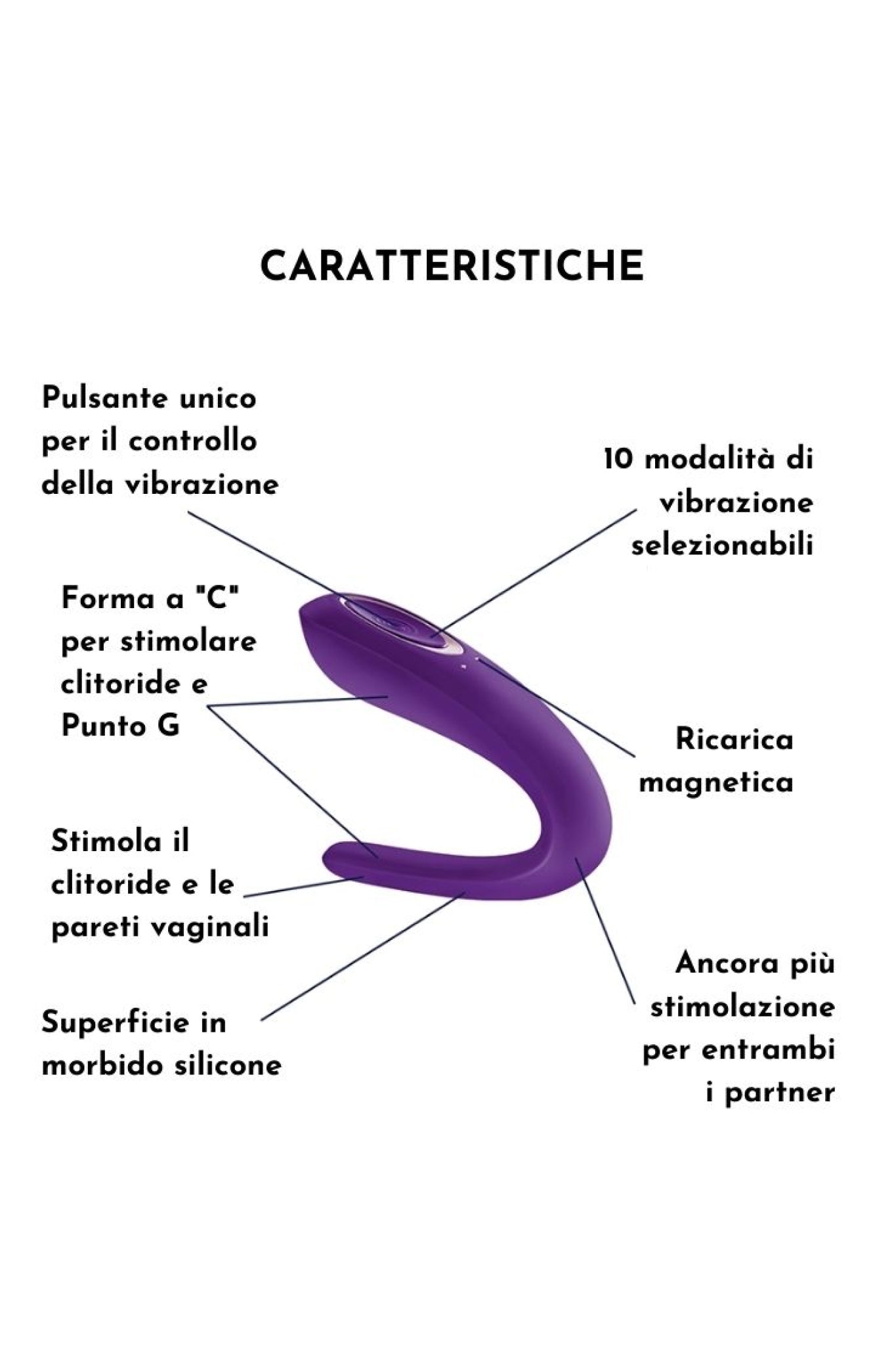 Le jouet pour partenaire de Satisfyer est un jouet sexuel pour couples conçu pour stimuler les deux partenaires pendant les rapports sexuels. Partner Toy, a la forme typique en "C " des vibrateurs pour couples, qui s'enroule autour du clitoris en stimulant le point G, et en même temps vibre sur le pénis. Il est ergonomique, petit et compact, avec 10 modes de vibration. Le vibrateur pour couples Partner Toy rendra votre relation plus stimulante et le sexe plus excitant. Fabriqué en silicone de qualité médicale, il est étanche et rechargeable grâce au câble magnétique inclus.