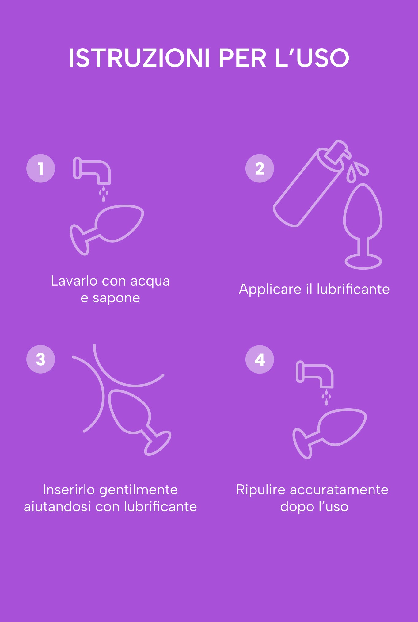 Lubrifica il plug e inseriscilo nell'ano. Si consiglia di usarlo con un lubrificante a base d'acqua. Lavalo prima e dopo l'uso con un toy cleaner.