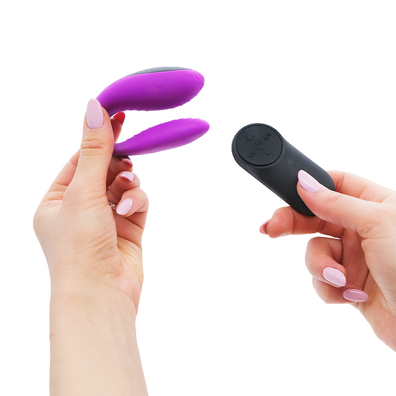 Accendi il toy con il tasto ON, applica lubrificante e inserisci la parte più piccola nella vagina, appoggiando l’altra sul clitoride. Collega il telecomando e regola la vibrazione con + e -.