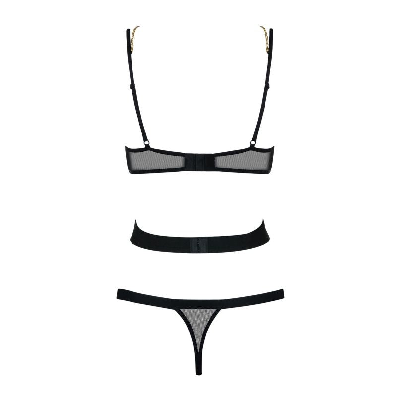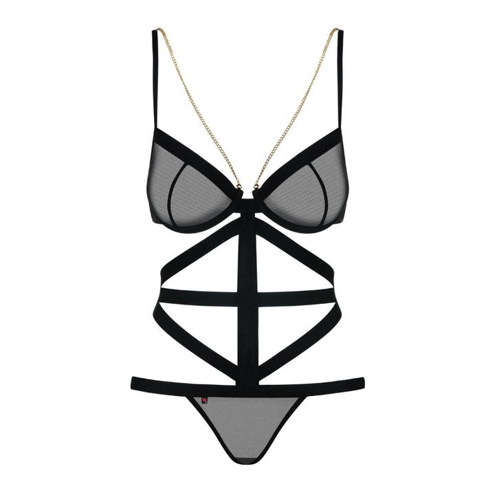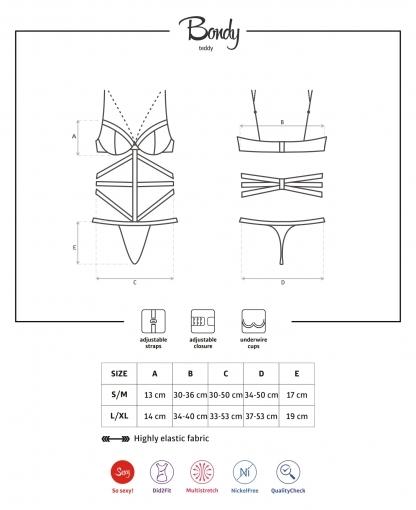 Bondy Teddy di Obsessive è un body sexy che richiama il fascino e la trasgressione del bondage. Il gioco di intrecci delle strisce nere elastiche sulla pelle si ispira infatti alle legature del bondage, mentre le trasparenze del reggiseno e del perizoma lasciano intravedere le vostre zone più sexy. Il reggiseno è dotato di ferretto per un sostegno ideale ed è impreziosito da una catenina dorata nickel free che scorre lungo la scollatura. Spalline e gancetti sono regolabili, per assicurarvi il massimo del comfort. Giocate a fare la mistress o la slave del vostro partner, la notte sarà indimenticabile!